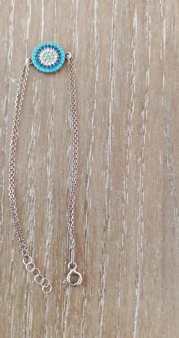 Nakışlı turkuaz detaylı, zincirli bohem tarzda bileklik. Gri zincir, canlı nakışla uyumlu, günlük kullanıma uygun. Nazar boncuklu gümüş bileklik 925 bende uygulamadan aldım ama ben beyaz renklı gümüş seviyorum aldığım fıyatı koydum ama fıyatı ındırım yaparım