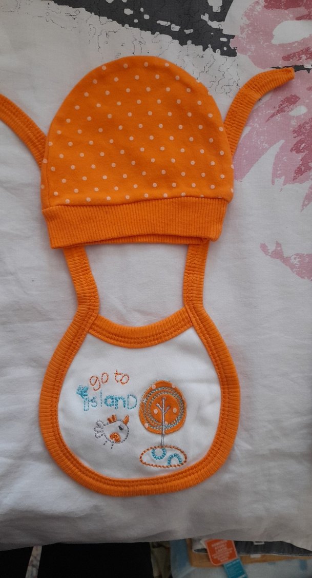 Nakışlı ağaç ve kuş desenli, yumuşak dokulu turuncu renkli bebek önlüğü ve şapka takımı.