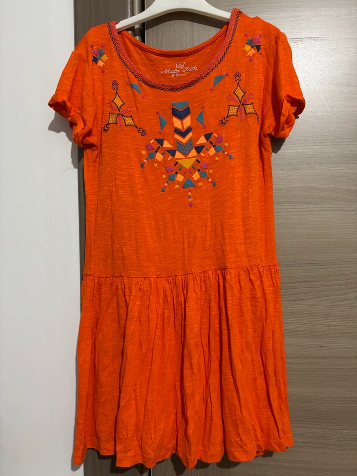 Bu renkli turuncu elbise kısa kollu, yuvarlak yakalı ve nakışlı boncuk detaylara sahip. Salaş kesim ve midi boyda, bohem stili için uygun. 9-10 yaş