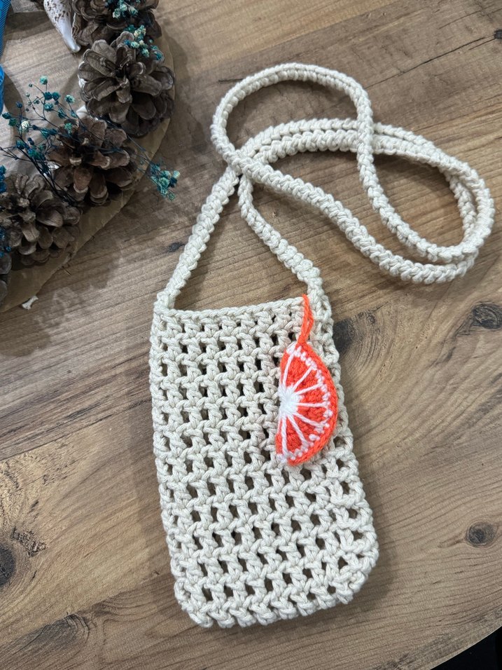 Bohem tarzı kadın çapraz çanta, örme kumaş ve dantel detaylı, turuncu nakışlı sade günlük kullanım için uygun.
