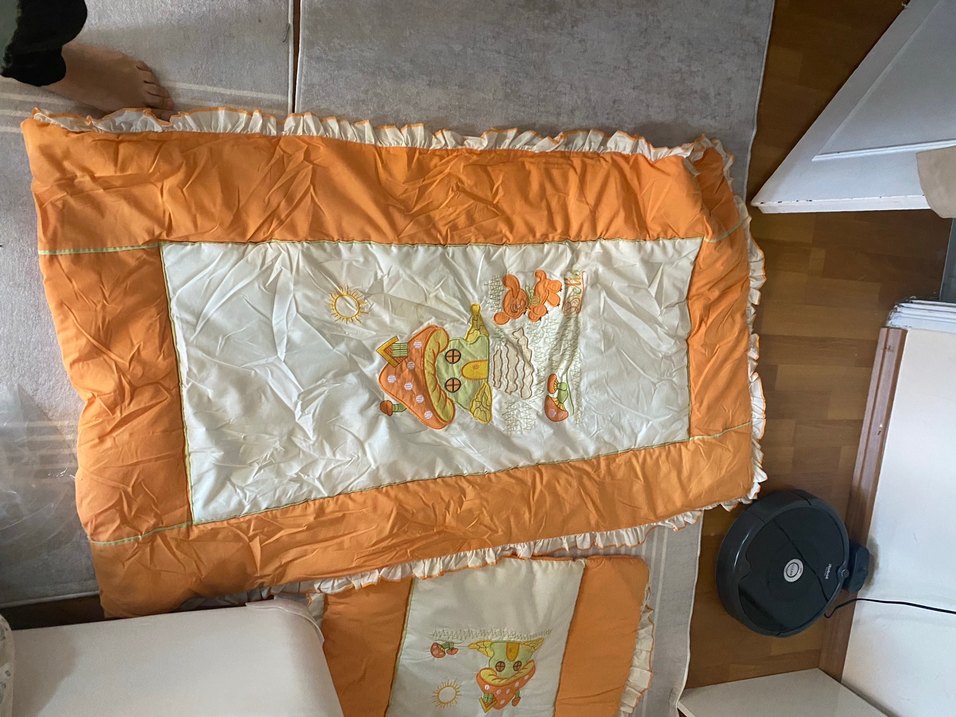 Nakışlı desenlere sahip açık turuncu çocuk uyku seti. Yumuşak kumaş ve fırfırlı kenarlarla rahat kullanım sağlar. ️
