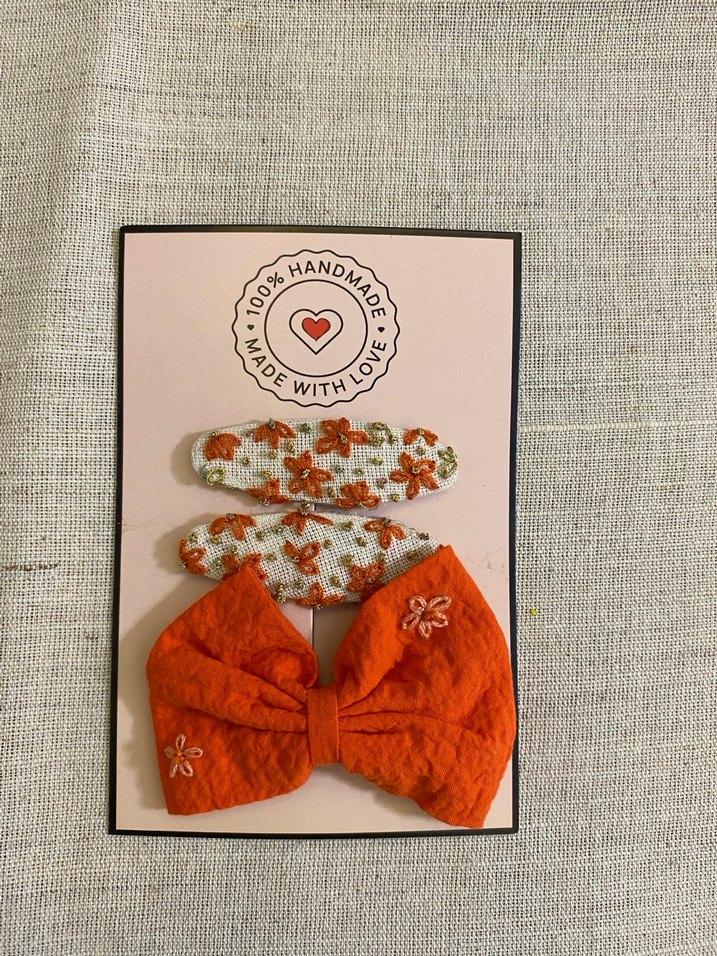 Nakışlı detaylara sahip turuncu fiyonk toka ve turuncu çiçek işlemeli iki beyaz toka içeren bohem tarzda saç aksesuarı seti.