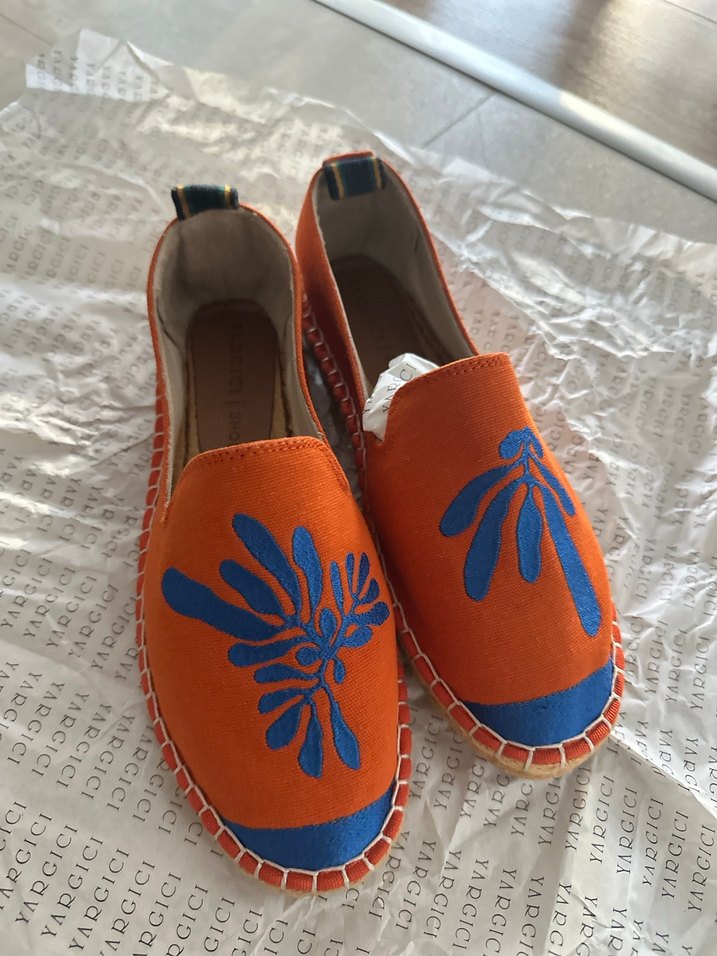 Nakışlı ve boncuklu detaylara sahip renkli turuncu espadriller, dolgu topuklu ve kauçuk tabanlı, günlük kullanım için uygun.