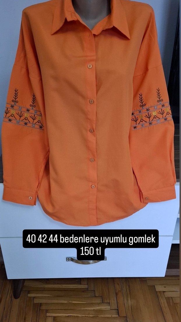 Nakışlı kol detayları ve düğmeli önü olan turuncu uzun kollu gömlek. Yaka tipi klasik, bol kesim ve kısa boydadır. 40, 42, 44 bedenlere uygundur. Fiyatı 150 TL.