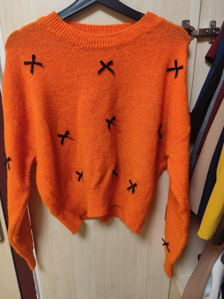 Bu örgü kazak, bol kesim, uzun kollu ve yuvarlak yaka özelliklerine sahiptir. Renkli nakış detaylarıyla yumuşak ve rahat bir kumaştan yapılmıştır.