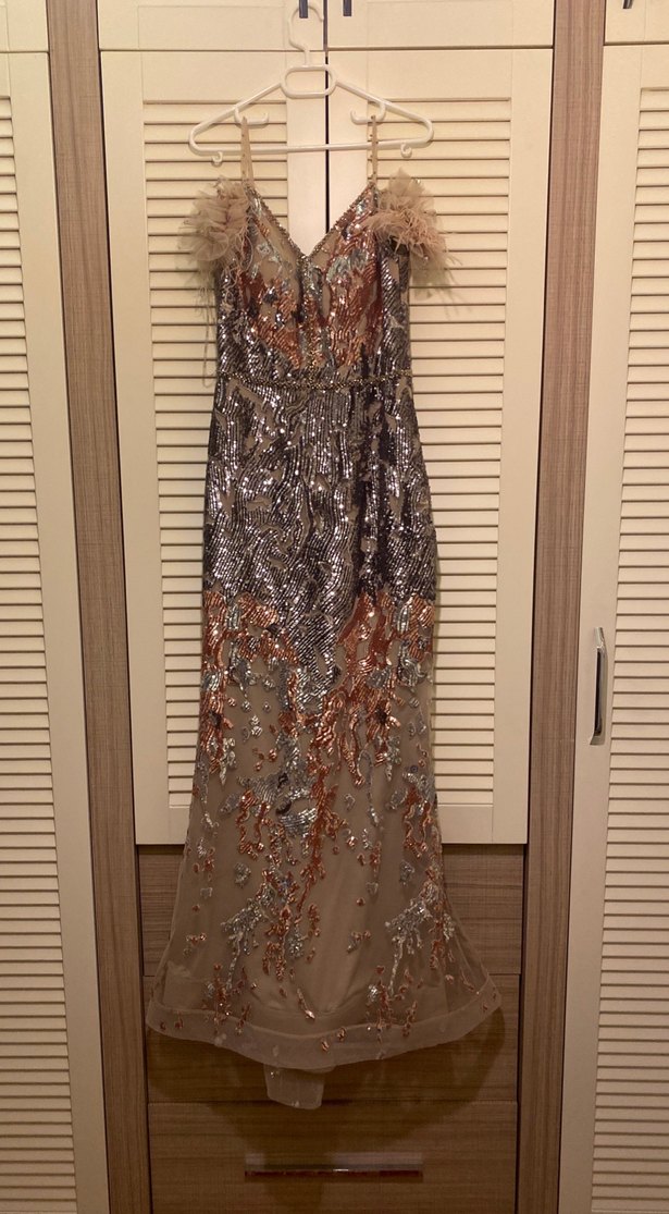 Nakış işlemeli ve askılarında tüy detayları bulunan uzun abiye elbise. Straplez yakalı ve vücuda oturan kesime sahip, düğünler için uygun. ✨