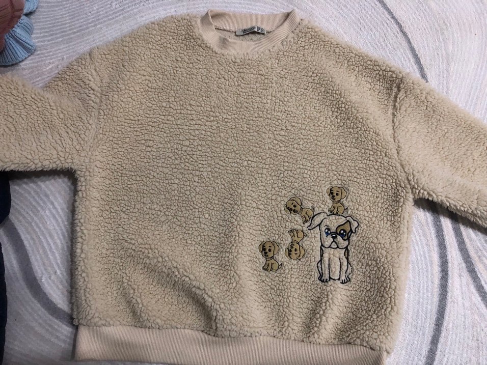 Bej renkte, tüylü dokulu ve nakışlı yavru köpek desenli pofuduk sweatshirt