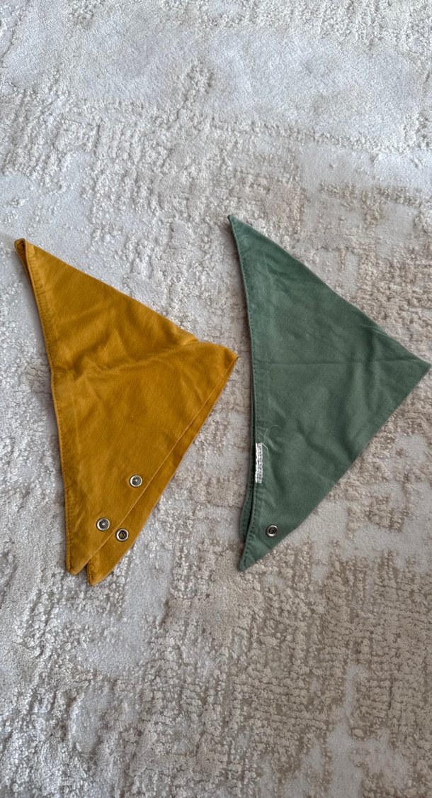 Nakışlı detaylara sahip kahverengi ve gri renklerde üçgen şekilli bebek önlükleri, çıtçıtlı ve yumuşak kumaşlı.