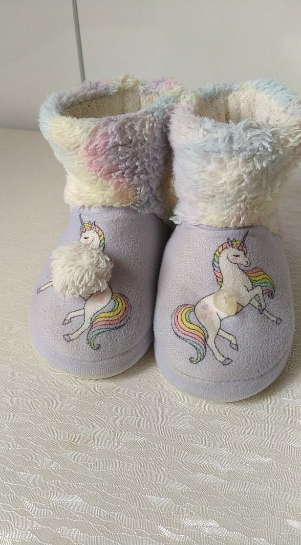 Nakışlı unicorn desenli, pastel renkli yumuşak kürklü kız sıcak terlikler, bohem ve retro tarzda.