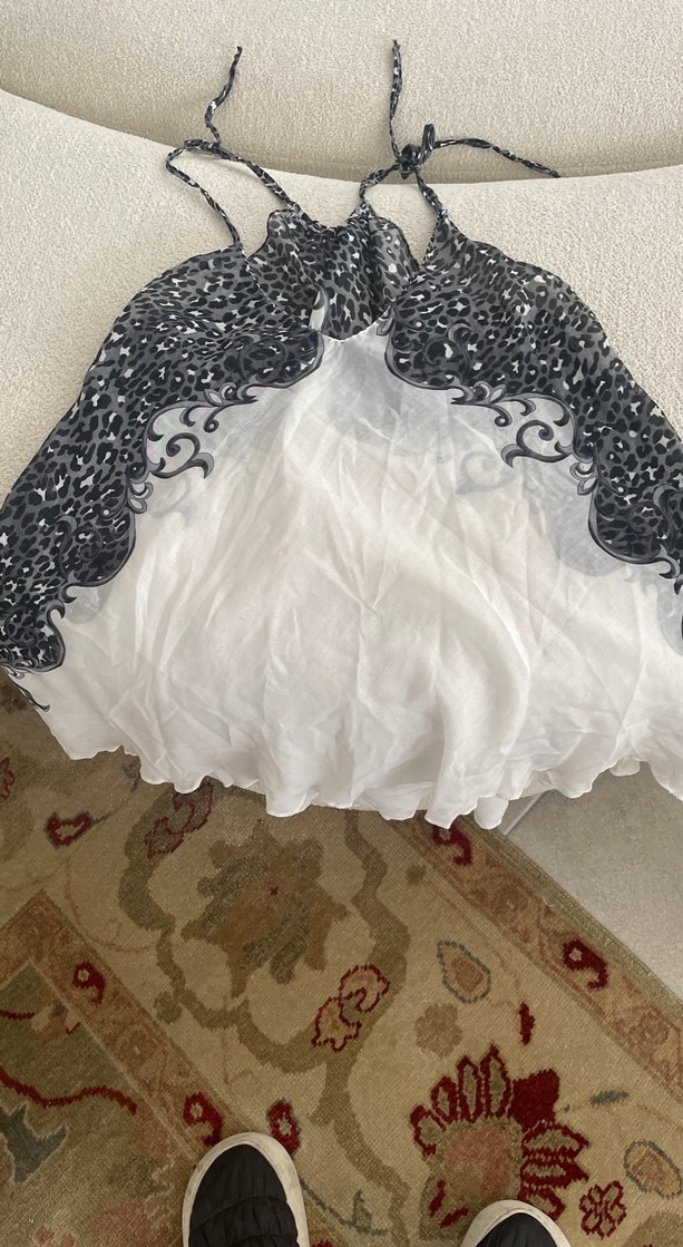 Nakışlı desene sahip uzun, askısız ve kolsuz hamile geceliği. Rahat kalıp ve gri-beyaz renklerle tasarlanmıştır.