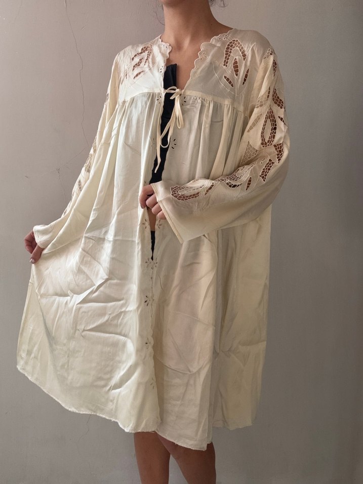 Uzun, beyaz ve bol kesimli bu sabahlık, kollarda ve yakada nakış detaylarıyla bohem tarzını yansıtıyor. Uzun kollu ve hafif bir kumaşa sahip.