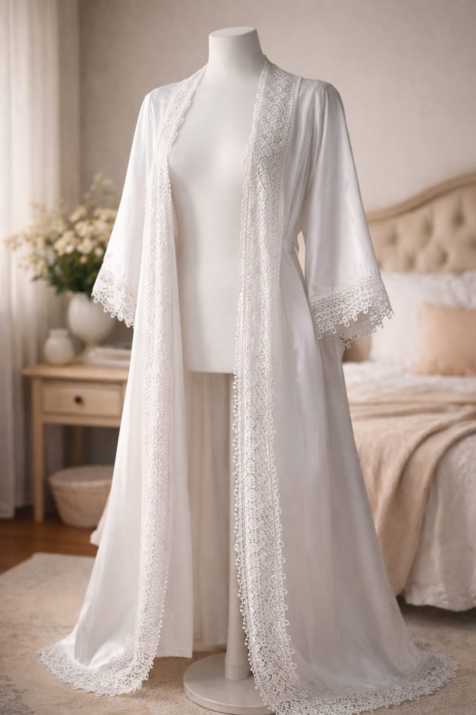 Uzun boy, bol kesim ve uzun kollu beyaz kadın sabahlık. Kenarları zarif nakışlarla süslenmiş, rahat ve şık bir görünüm sunar. ️