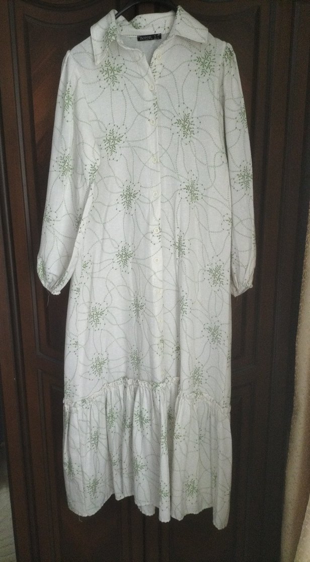 Beyaz keten kumaştan uzun, bol kesim elbise. Uzun kollu, kayık yaka, nakışlı ve drapeli tasarım bohem tarzı yansıtır.