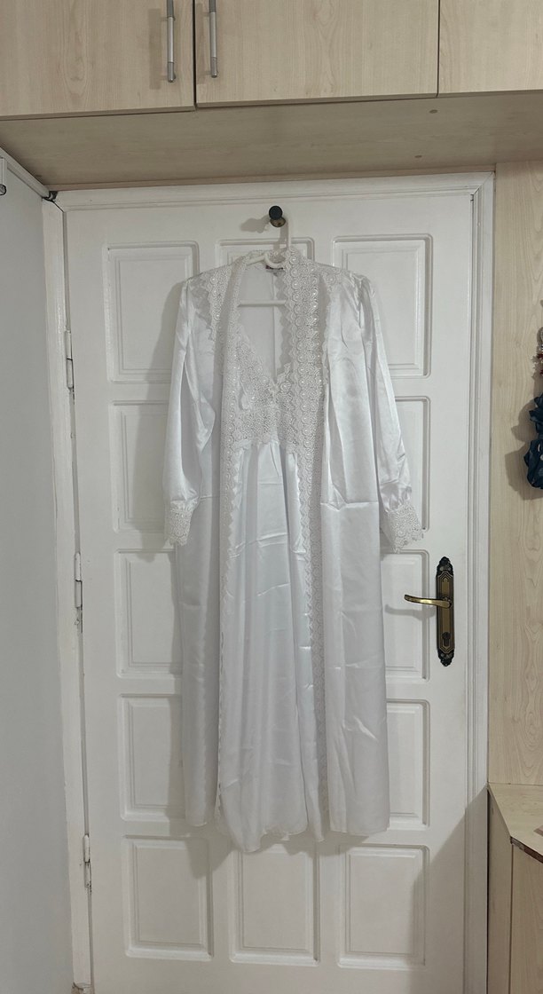 Parlak beyaz kumaş ve nakış detaylı, uzun kollu, bol kesim vintage tarzda uzun kadın sabahlık. Ve elbise ile beraber