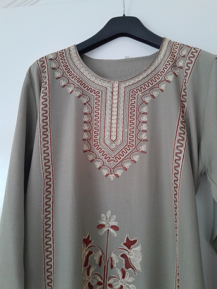 Nakışlı çiçek desenleriyle haki uzun elbise. , Modest ve bohem stiller için uygundur. ümreden alındı boy 1.27 gög 60 basen62 kol uz 56 gen 21 cm ölçüleri baz alın