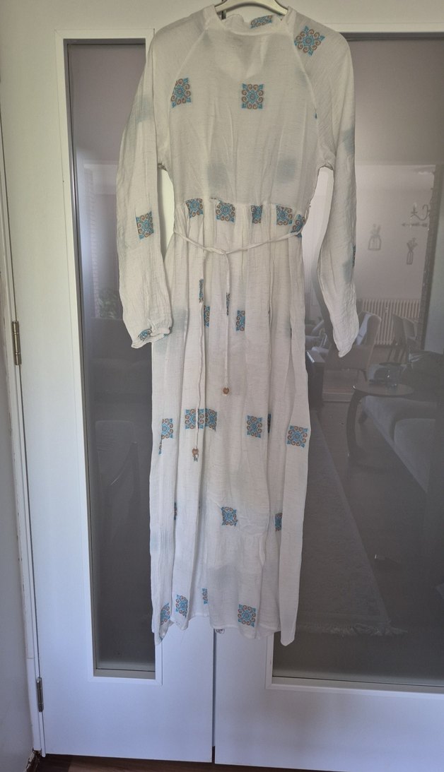 Nakışlı desenlere sahip, uzun ve bol kesim bir elbise. Uzun kollu, yuvarlak yakalı ve belden bağlamalı drapeli tasarıma sahiptir. etek kısmında astar vardır....beden 36 yazıyor ama 38 beden için uygundur...