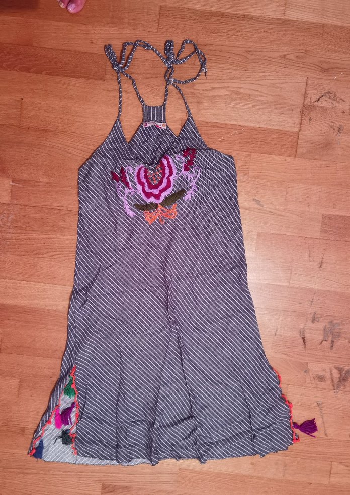 Nakışlı çiçek desenli, uzun bohem elbise. Halter yaka, askılı kollu ve püskül detaylıdır. Salaş kesimi ve çok renkli tasarımı ile günlük kullanıma uygundur.