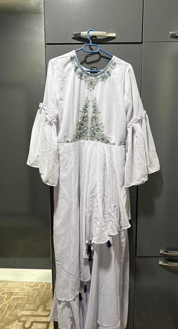 Nakışlı desenlere ve drapeli uzun kollara sahip, bol kesim uzun kadın elbisesi. V yakalı, bohem tarzda ve beyaz renkte, gri nakışlı.