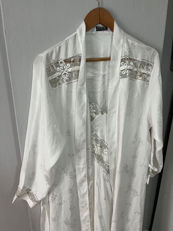 Nakışlı detaylara sahip uzun, bol kesim kadın sabahlığı. Vintage bohem tarzında, uzun kollu ve beyaz renkte gri vurgular içerir. Sıfır kullanılmadı marka temsildir