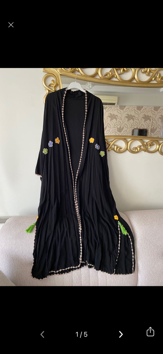 Uzun, bol kesim kadın gömlek , koyu renkli kumaş üzerine renkli nakışlı çiçek desenlerine sahiptir. Uzun kollu ve kenarları süslemeli bohem tarzda. Tesettüre uygun modeldir 46 bedendir 44’e 42’ye 48 bedene de olur