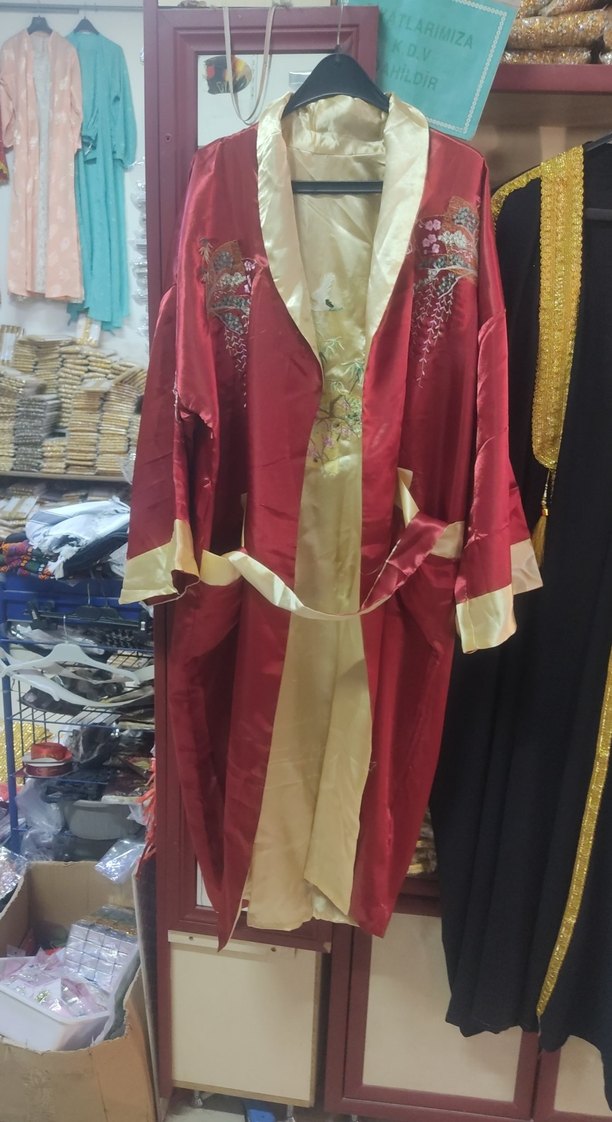 Parlak bordo renkli, nakışlı uzun sabahlık, bol kesim ve uzun kollu. Geleneksel tarzda, bohem dokunuşlu. açiklama :erkek modellerde mevcut çift taraflı kullanilabilir