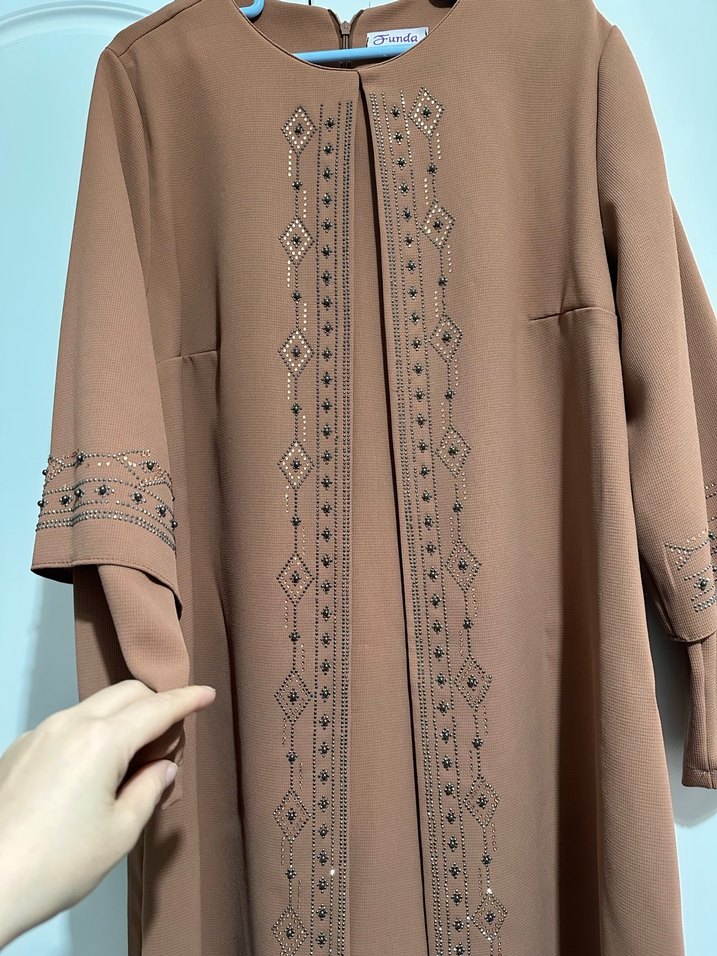 Soğan kabuğu renkte, ilk resimdeki renk diğerleri ışık yansıması nakış detaylı uzun elbise. V yaka, uzun kollu ve regular fit kesime sahip, kına düğün kullanıma uygun şık bir parça. ✨içli dışlı ayrı gibi gözüküyor ama tek parça anneler içim çok şık sadece düğünde kullnılda