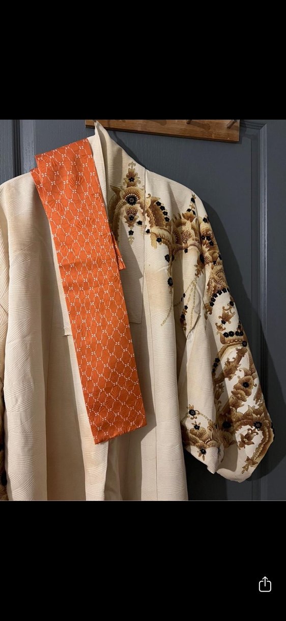 Uzun kimonosu, notched lapel yakalı ve nakış işlemeli ipeksi kumaştan yapılmıştır. Askılı kollu ve drapeli, günlük kullanıma uygun regular fit. Turuncu desenli kuşaklı vintage tarz. Japonya’dan bizzat alınmıştır. Kullanılmamıştır
