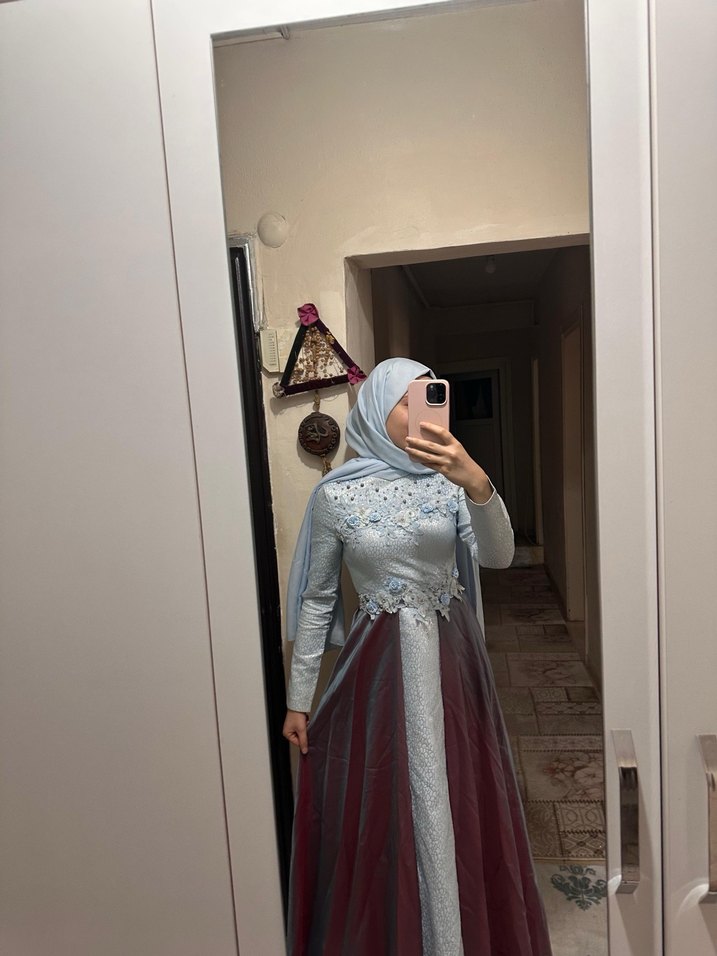 Yüksek yakalı ve uzun kollu, nakış detaylı uzun abiye elbise. Bordo ve gri tonlarında, drapeli, vücuda oturan bohem tarzda düğün elbisesi. Bir kere düğünde kullanıldı çok temizdir