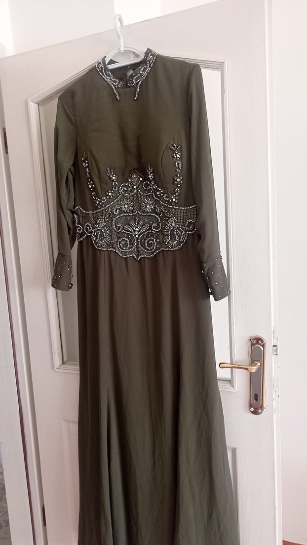 Bu haki renk uzun abiye elbise, yüksek yakalı ve uzun kolludur. Bel ve manşetlerde detaylı nakış işlemeleri bulunur. Vintage tarzda, bol ve drapeli kesime sahiptir.