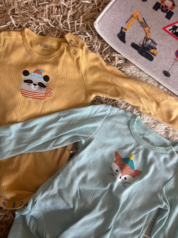 Nakışlı hayvan desenli, uzun kollu, triko kumaştan yapılmış pastel renklerde, yuvarlak yakalı bebek bodyleri.