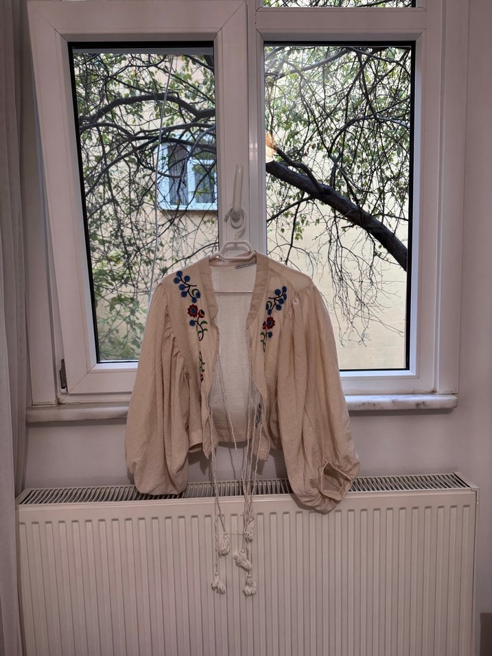 Yumuşak tekstil kumaştan, uzun drapeli kollu, renkli çiçek nakışlı, gevşek kesim bej bluz.