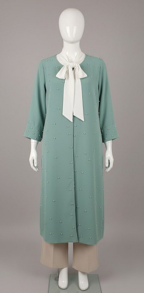 Nakışlı detaylara ve klasik stil fiyonk yakaya sahip, bol kesim uzun kollu bej elbise. Pastel ton yumuşak bir dokunuş katıyor. temiz . kusuru yok 40 bedene de uyumlu.