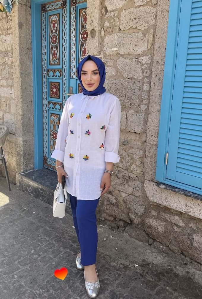 Pamuklu beyaz tunik, yüksek yakalı ve uzun kolludur. Nakışlı boncuk süslemeleriyle günlük, sade sokak stiline uygundur. Bir kez fotoğraf çekimi için giymiştim 10 dakka