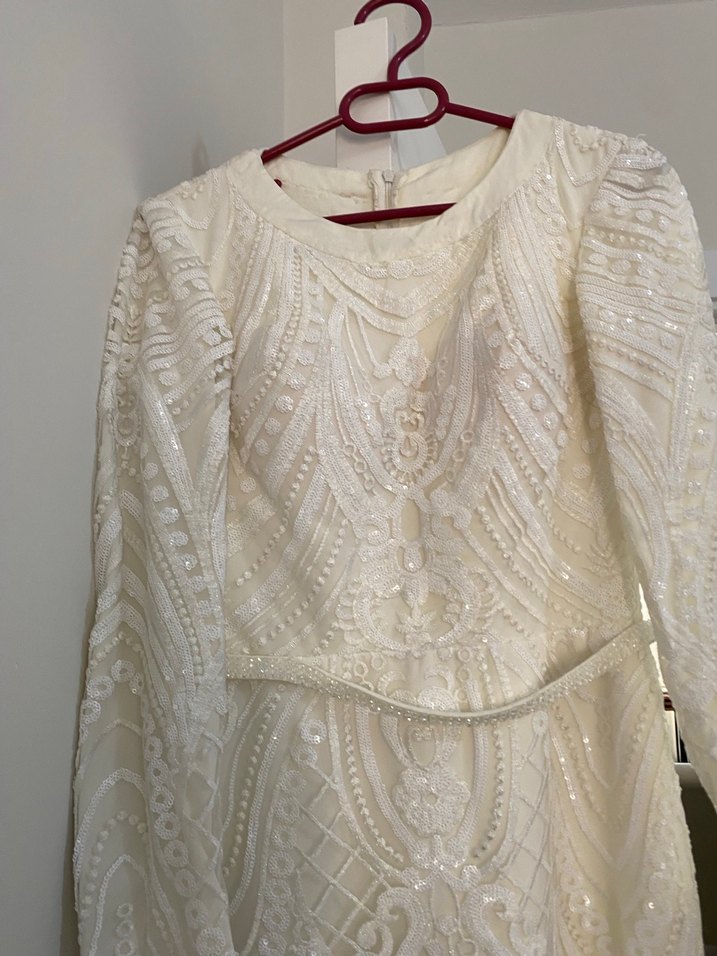 Nakışlı Uzun Kollu Beyaz Nişan Elbisesi