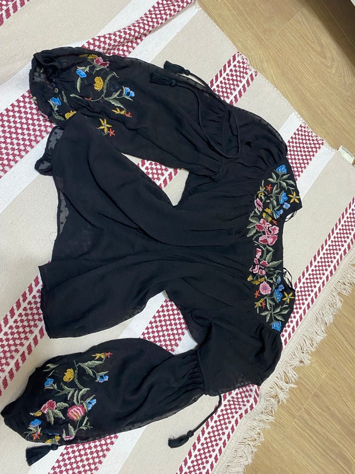 Bu bol kesim bluz, askısız yaka ve uzun kollarda renkli nakışlara sahiptir. Yumuşak tekstil kumaştan yapılmış, günlük kullanım için koyu tonlarda drapeli bir siluet sunar. ürünün sadece kolları hafif transparan iç göstermez