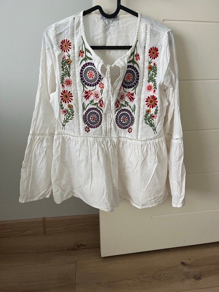 Pamuklu, uzun kollu, nakışlı çiçek desenleriyle süslenmiş beyaz, bol kesim V yaka düğmeli bluz. Günlük kullanım için rahat ve şık.