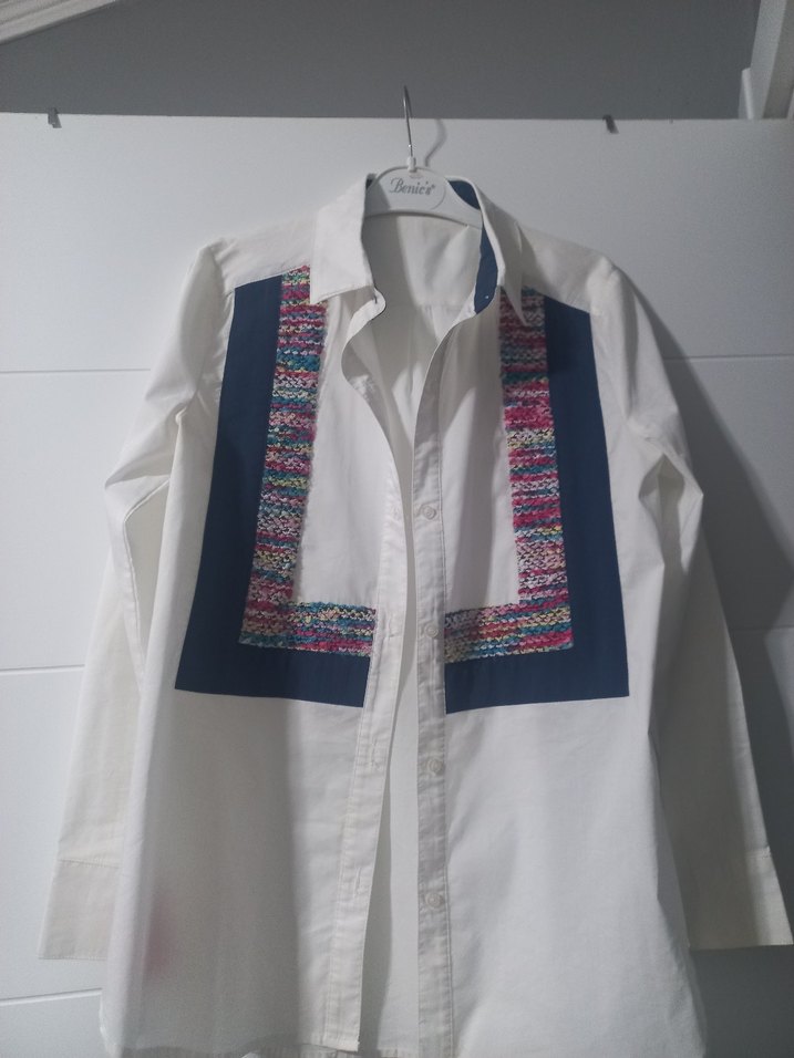 Uzun kollu, yakası açık ve nakışlı detaylara sahip çok renkli kadın gömleği. Düğmeli ve normal kesim, günlük kullanıma uygundur.