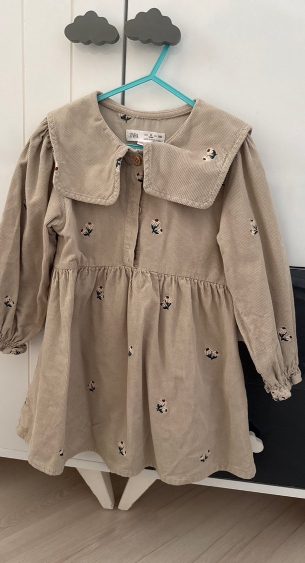 Yumuşak süet kumaştan, uzun kollu, düğmeli, nakışlı detaylara ve çıkıntılı yaka sahip bej renkli bol kesim kız elbisesi.