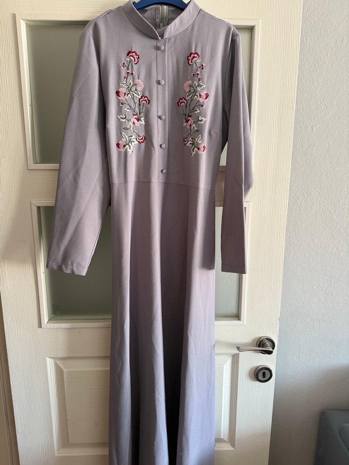 Uzun, bol kesim elbise uzun kollu ve yüksek yakalıdır. Ön kısmında vintage tarzda nakışlı çiçek desenleri ve düğme detayları bulunur. Gri-mor tonlarda yumuşak sentetik kumaştan yapılmıştır.