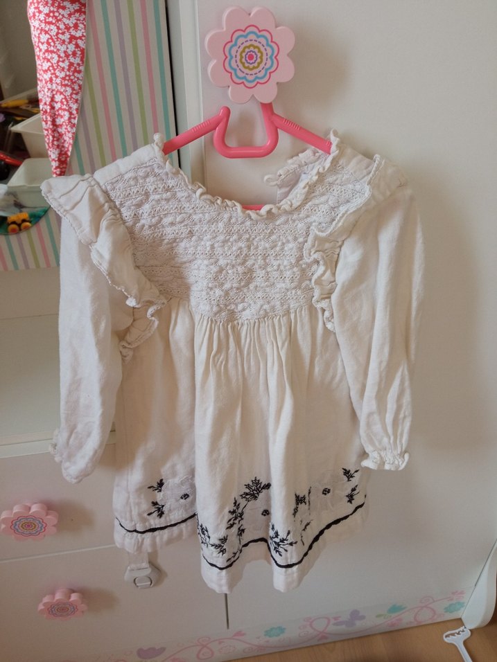 Pamuk kumaştan yapılmış, uzun kollu, V yakalı beyaz kız elbisesi. Nakışlı çiçek desenleri ve fırfır detayları ile bol kesim rahatlığı sağlar.