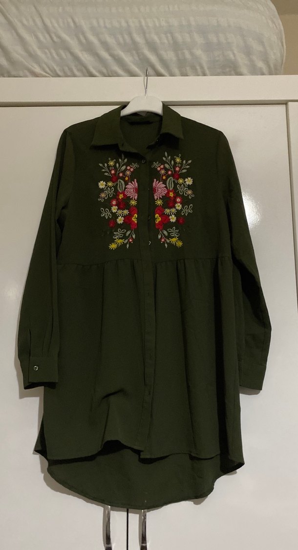 Haki renkte, uzun kollu ve yüksek yakalı hamile bluzu. Renkli çiçek nakışları ve düğmeli ön detaylarıyla bohem tarzda, bol kesim.