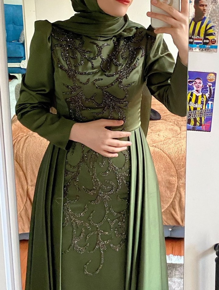 Haki renkli, nakış işlemeli uzun abiye elbise, uzun kollu ve yüksek yakalıdır. Drapeli ve vücuda oturan kesimiyle şık ve gösterişlidir. ✨