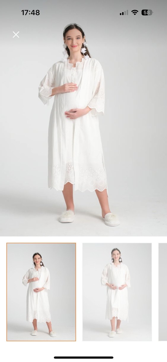 Sıfır hiç giyilmedi. Yıkadım ütüledim ama giymek nasip olmadı. Çok kaliteli çok güzel duruyor çok istemiştim ama giyemedim. Nakışlı ve salaş kesim beyaz gecelik ve sabahlığı. Hamilelik ve emzirme için uygun, tekne yaka detaylıdır.