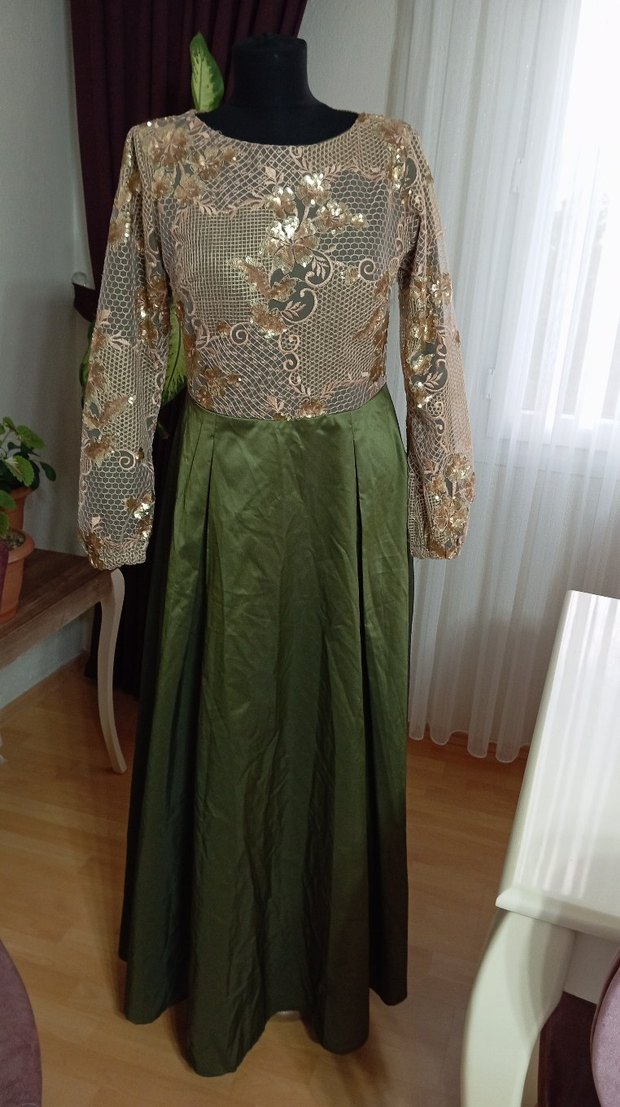 Vintage tarzda, bol kesim ve drapeli uzun kollu abiye elbise. Koyu haki renkte, parlak nakış detaylı, yuvarlak yakalı, düğünlere uygun. dar kalıptır 42 bedene de olur.