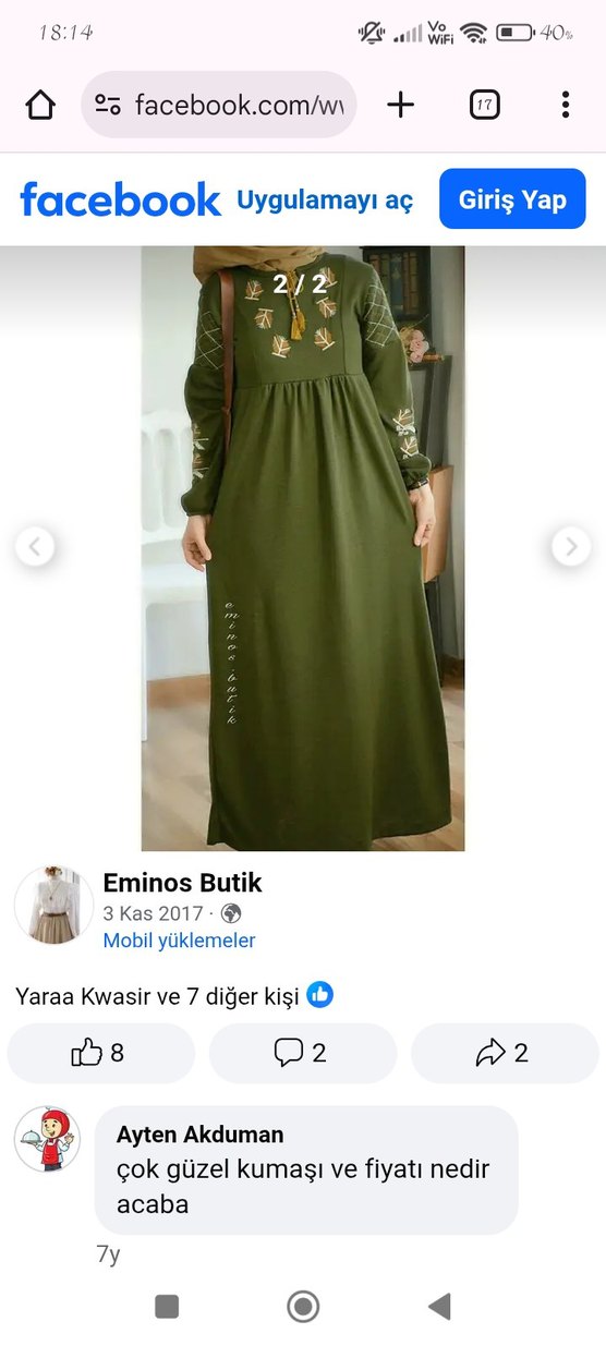 Kemerli, nakışlı detaylı, uzun kollu ve yuvarlak yakalı haki rengi uzun elbise. Sentetik kumaştan, salaş kesim ve günlük kullanıma uygun.