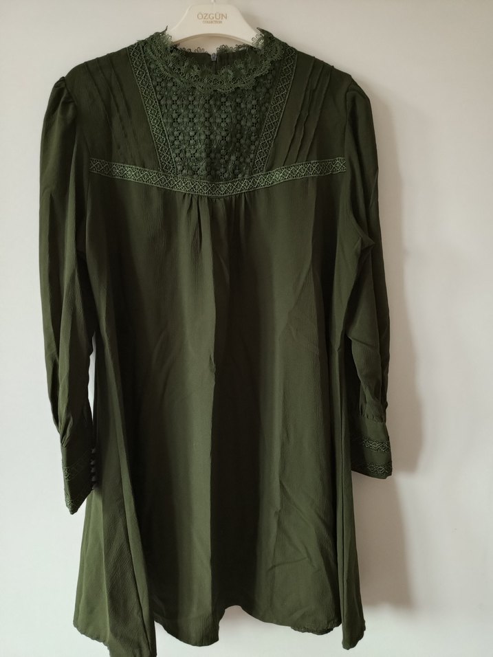 Koyu haki renkli, yüksek yakalı ve bol kesim keten tunik. Nakış detayları ve uzun kollarıyla bohem, vintage tarzda günlük kullanım için uygun.