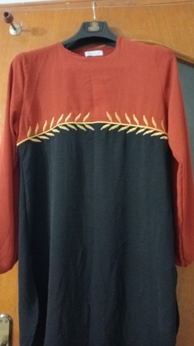 Kadınlar için uzun kollu, bol kesim, drapeli ve nakışlı detaylara sahip tunik. Yuvarlak yaka, sentetik kumaş, koyu kırmızı ve siyah renklerde, günlük kullanım için uygundur.