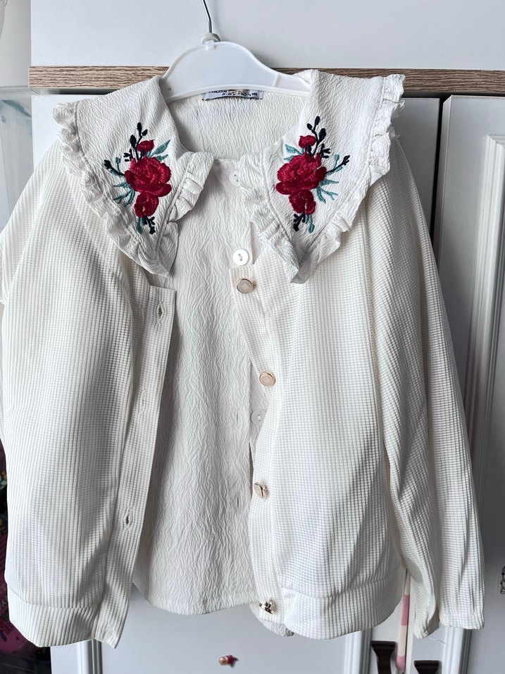 Nakışlı çiçek detaylı yakası, düğmeli önü ve uzun kollu,gömlek şort etek ve hırka temiz ürün