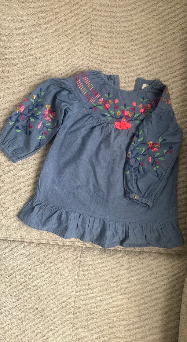 Uzun kollu, nakışlı çiçek desenleriyle süslenmiş bol kesim kot elbise. Yuvarlak yaka ve etek ucunda fırfır detayları ile bohem tarzı yansıtıyor. Kot görünümlü