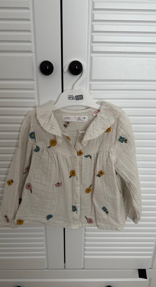 Bol kesim, beyaz keten kız gömleği, uzun kollu, düğmeli, yakalı ve renkli nakışlı çiçek desenleriyle bohem tarzını yansıtıyor.